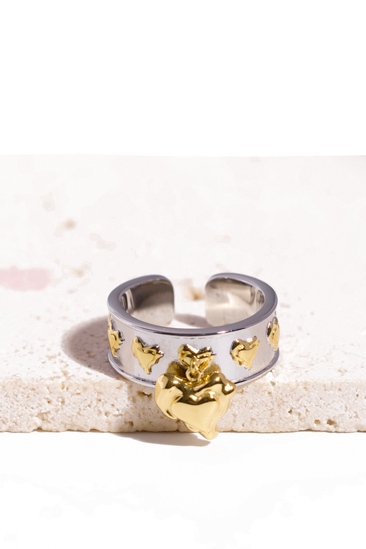 [Ring] Two-Tone Adjustable Ring with Dangling Gold Heart Charm, Stainless Steel 18K Gold-Plated
