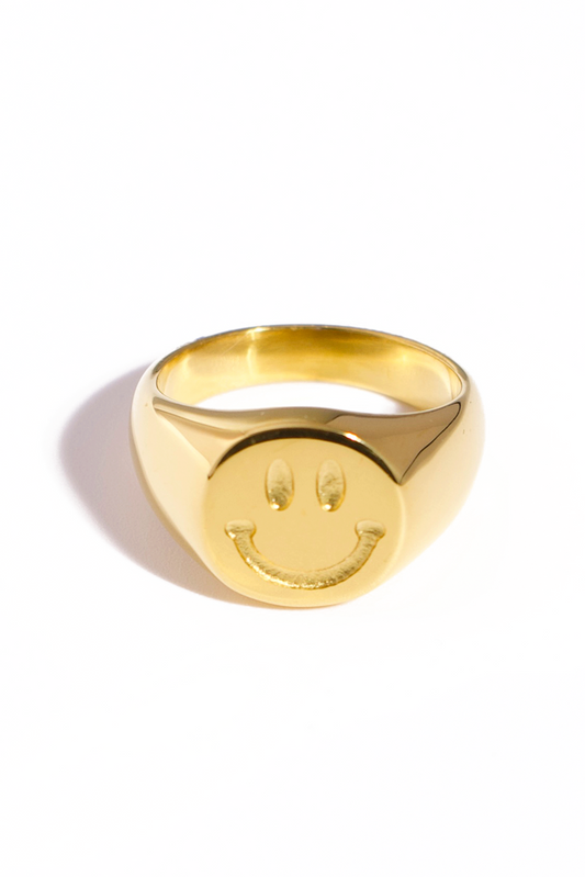 [Ring] 18K Gold Plated Smiley Face Signet Ring – Playful Statement Design, Stainless Steel